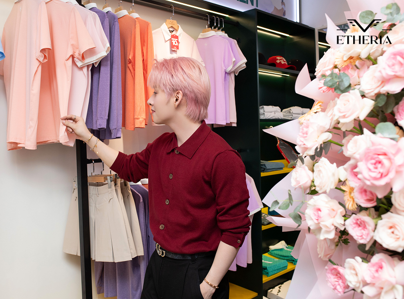 Không chỉ dừng lại ở phần trình diễn, Hùng Huỳnh còn thoải mái dạo quanh cửa hàng, thử đồ và dành thời gian trải nghiệm các sản phẩm của ETHERIA. Trong lúc trò chuyện cùng fan, anh chia sẻ rằng mình vừa chuyển hướng từ bộ môn cầu lông sang pickleball – một sự thay đổi khiến anh gặp không ít khó khăn trong việc kiểm soát lực đánh. Để cải thiện kỹ thuật, Hùng Huỳnh đã tìm đến sự tư vấn của anh Vũ Đức Việt – CEO SUNVIET. Anh Việt không chỉ đưa ra lời khuyên chuyên môn mà còn bật mí một “bí kíp” quan trọng: “Trang phục thoải mái và linh hoạt chính là trợ thủ đắc lực giúp bạn chơi thể thao hiệu quả hơn.”